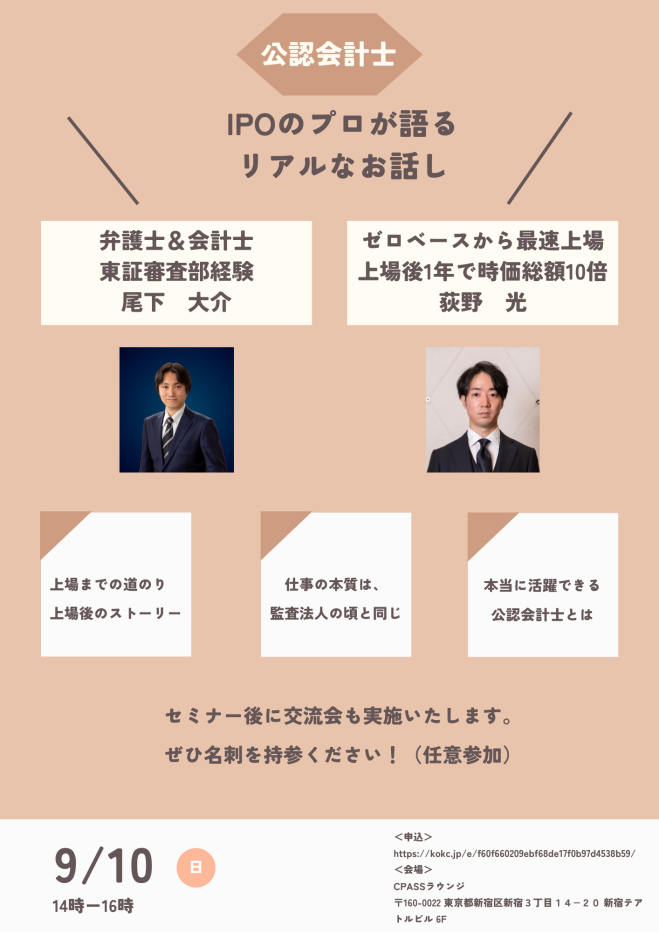 尾下弁護士が「若手に伝えたいIPO実務研修」(日本公認会計士協会準会員会東京分会、9/10開催)の研修会にゲスト講師として参加します。 2023 / 08 / 04 News 尾下弁護士が、2023年9月10日に開催される日本公認会計士協会準会員会東京分会「若手に伝えたいIPO実務研修」にゲスト講師として参加いたします。 若手に伝えたいIPO実務研修 2023年9月10日(東京都) – こくちーずプロ 若手に伝えたいIPO実務研修 2023年9月10日(東京都): 本にはないリアルなお話し – こくちーずプロを使えば、驚くほど簡単で安全なイベントの告知・集客ができます。登録… www.kokuchpro.com « ジャフコグループ㈱運営のIPO準備企業向けプログラム「BackOfficeアカデミー実践編 第5回」(12/20開催)に当事務所の弁護士が講師として登壇します。 当事務所のIPO助言先である㈱M&A総研ホールディングスの東証プライム市場への市場変更が認められました。 »