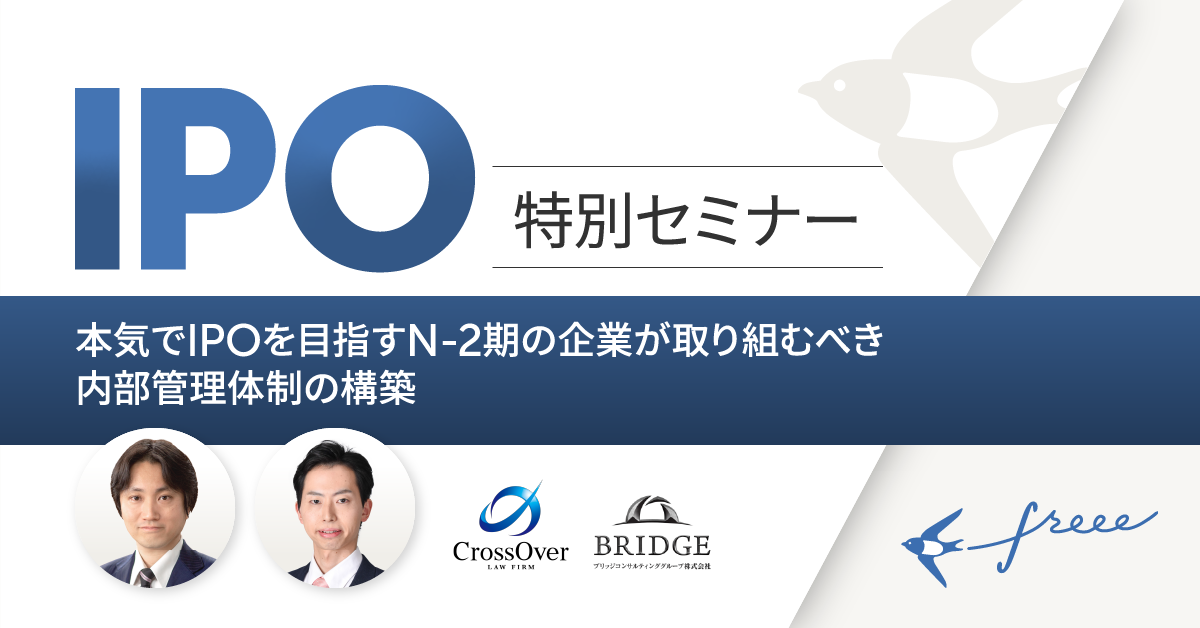 尾下弁護士がfreee及びブリッジコンサルティンググループ共催のWebセミナーに登壇します。 2020 / 11 / 09 News 尾下弁護士が、2020年11月13日(金)に、freee㈱及びブリッジコンサルティンググループ㈱との共催により開催されるオンラインセミナー(「本気でIPOを目指すN-2期の企業が取り組むべき内部管理体制の構築」)に登壇する予定です。 IPO特別セミナー 本気でIPOを目指すN-2期の企業が取り組むべき内部管理体制の構築 CrossOver法律事務所、ブリッジコンサルティンググループ株式会社との共催で、IPO特別セミナーを開催いたします。 CrossOver法律事務所代表弁護士の尾下大介様とブリッジ… go.freee.co.jp « 尾下弁護士が公認会計士 清風会のセミナーに登壇します。 尾下弁護士が㈱REAPRAの社外監査役に就任いたしました。 »